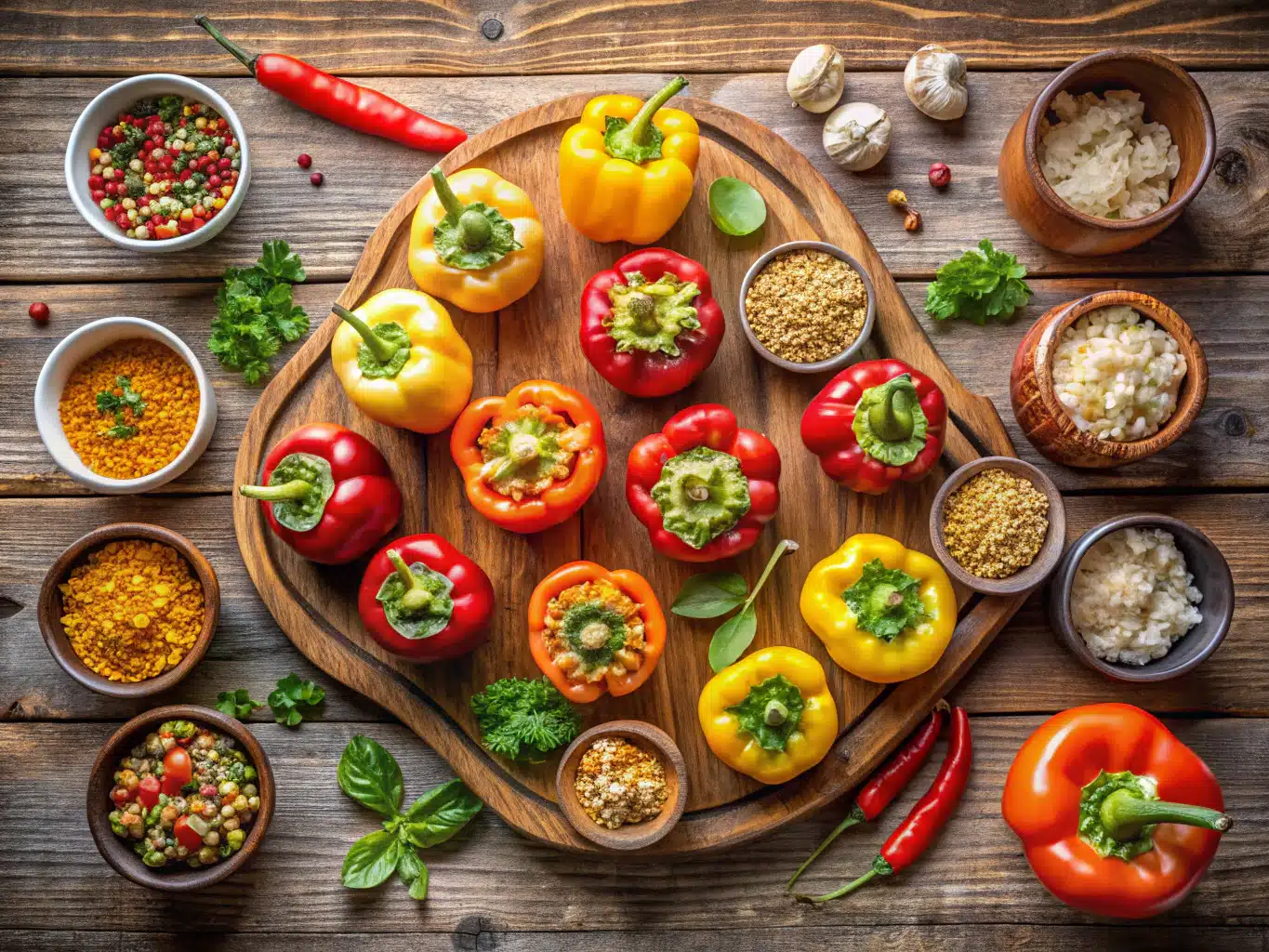 Unlike bell peppers that take longer to cook and often require parboiling, mini peppers have thinner walls, sweeter flesh, and roast faster in the oven. Plus, their size makes them incredibly versatile—you can serve them as finger foods or as part of a vibrant mezze board like this hummus platter. Their natural sweetness also plays well with bold or tangy fillings: think goat cheese, spicy sausage, or even smoky lentils.