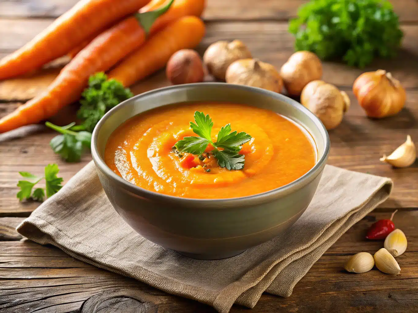 CARROT GINGER SOUP is a comforting, dairy-free soup packed with the natural sweetness of carrots and the warming zing of ginger. Quick to prepare and perfect for cozy nights.