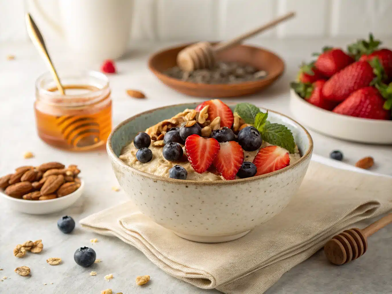 A: A blend of rolled oats, unsweetened almond milk, plain Greek yogurt, chia seeds, a banana, and cinnamon. It’s packed with fiber, protein, and antioxidants without added sugars.