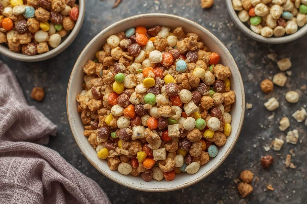 A customizable, crunchy snack mix featuring cereals, nuts, dried fruit, and chocolate chips—perfect for gifting, road trips, or late-night munching.