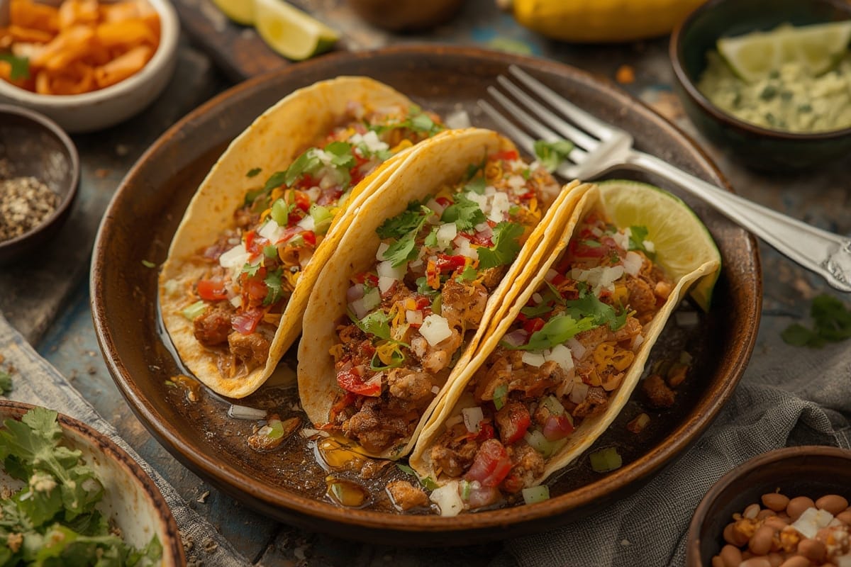 Great options include creamy avocado, pickled onions, shredded lettuce, salsa verde, chipotle mayo, jalapeños, roasted corn, or vegan crema. Mixing textures and flavors makes the perfect taco bite.