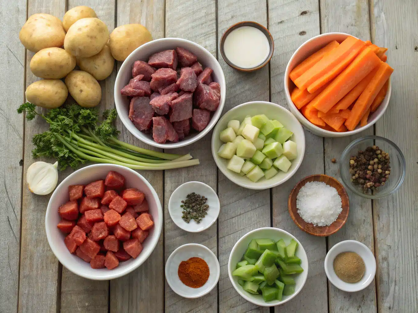 You’ll need beef chuck, carrots, onions, potatoes, tomato paste, broth, and seasonings.