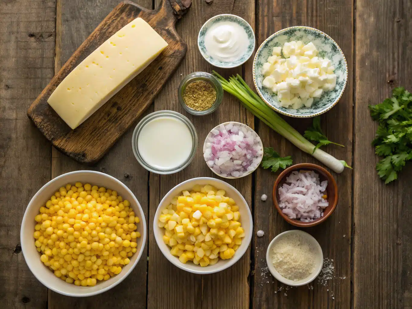 What are the five ingredients in corn casserole? The classic five are whole kernel corn, creamed corn, corn muffin mix, sour cream, and melted butter. That’s it—super simple and pantry-friendly.