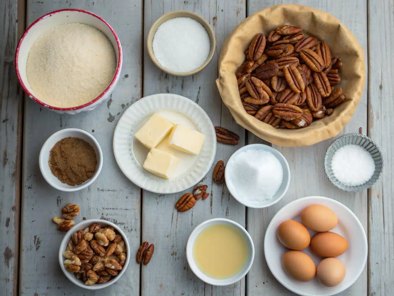 It typically includes toasted pecans, corn syrup, sugar (often brown), eggs, butter, vanilla, and an unbaked pie crust.